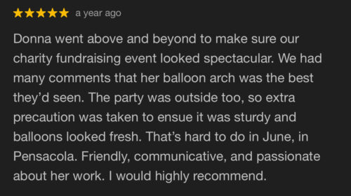 Since earning certification as a balloon artist in 2015, we have been honored to serve the people of Pensacola and surrounding areas with fabulous balloon decor and gifts. We specialize in backdrops, whimsical balloon bouquets, and party entertainment. Select Book Now to start your custom creation and get Blown Away By Balloons!